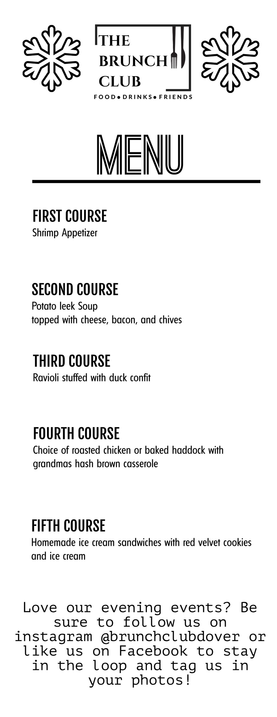 Join us Friday December 19th at 5:30pm for a holiday feast. $50 per person excluding tax and gratuity. Call us at 603-697-1016 to reserve.