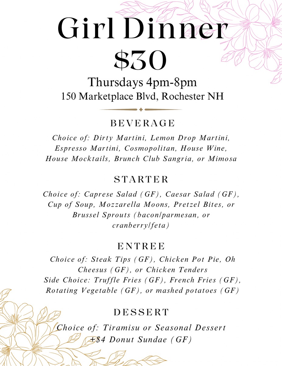 Join us for Girl Dinner 4-8pm at our Rochester location. (Regular menu still available). *Dine in only, cannot be combined with any other offer or discount.